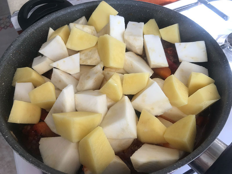 Üzerine 3 adet küp doğranmış kereviz ve 2 adet küp doğranmış patates ilave ediyoruz.