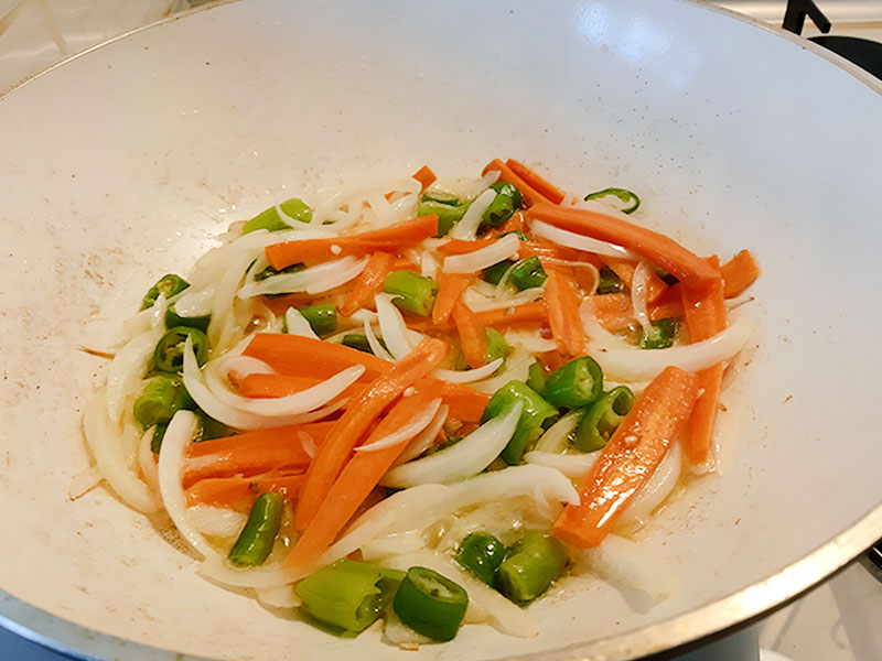 Bir tavada 1 adet jülyen doğranmış kuru soğan, 1 adet jülyen doğranmış havuç ve 2 adet yemeklik doğranmış yeşil sivri biberi yarım çay bardağı sıvı yağ ile kavuruyoruz.
