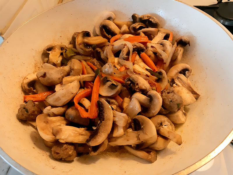 Üzerine 250 gram kültür mantarını yemeklik doğruyoruz. Mantar suyunu çekene kadar kavuruyoruz.