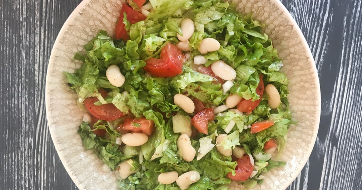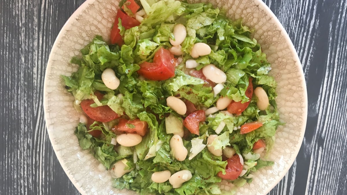 10 tane kıvırcık yaprağını yıkayıp süzdürdükten sonra bir salata kasesine doğruyoruz. Üzerine 1 tane domatesi küp küp doğruyoruz. (Dilerseniz kabuklarını soyabilirsiniz.) 3 tane arpacık soğanı yemeklik doğruyoruz. Üzerine 1.5 su bardağı haşlanmış kuru fasulye ilave ediyoruz. Yarım limon suyu, 2 yemek zeytinyağı, yarım tatlı kaşığı tuz ve 1 çay kaşığı pul biber ekleyerek hepsini harmanlıyoruz. Afiyet olsun…