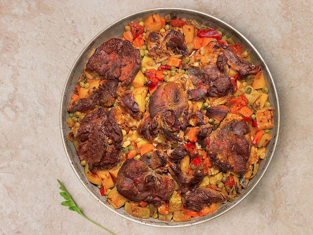 6 adet kuzu gerdan etini bir tencereye alıyoruz. Üzerine çıkana kadar su koyuyoruz ve yarım saat kanının çıkmasını sağlıyoruz. Süzüp düdüklü tencere alıyoruz. Suyunu çekene kadar mühürlüyoruz. Mühürleme işleminden sonra üzerine çıkana kadar su koyup düdüklüyü kapatıyoruz. Kaynadıktan sonra kısık ateşte 20 dakika pişiriyoruz. Fırın tepsisine 1 adet kuru soğanı yemeklik doğruyoruz ve pişirdiğimiz etleri de ilave ediyoruz. Üzerine 2 adet patates, 2 adet çekirdekleri çıkarılmış kapya biber ve 4 adet çarliston biber, 2 adet havuç, 2 adet iç kısımları alınmış yeşil kabak, 2 diş sarımsak ve 2 adet kabukları soyulmuş domatesi de küp doğruyoruz. Üzerine yarım kilo haşlanmış bezelye (yazdan buzdolabına koyduğunuz bezelyeleriniz varsa harika olur) koyuyoruz. 1 yemek kaşığı domates salçası, 1 çay bardağı sıvı yağ, 1 tatlı kaşığı tuz, 1 çay kaşığı pul biber, 1 çay kaşığı kekik ve yarım çay kaşığı karabiber ekleyip hepsini harmanlıyoruz.