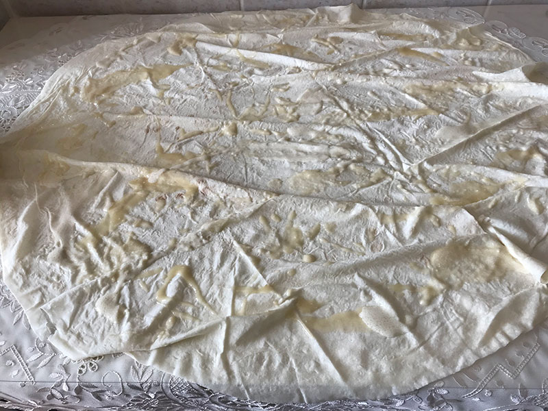 1 adet yufkayı tezgah üzerine seriyoruz. Hazırladığımız sostan kaşık yardımıyla her yerine gezdiriyoruz. Fırça yardımıyla da eşit şekilde her yerine sürüyoruz. İlk olarak üstten ve alttan ortada uçları birleşecek şekilde kapatıyoruz.