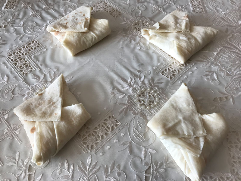 Tekrar kapattığımız yufkanın üzerine kaşık yardımıyla sostan her yerine gezdiriyoruz. İkinci olarak da sağdan ve soldan yufkaları ortada birleşecek şekilde kapatıyoruz ve bir kare oluşturuyoruz.