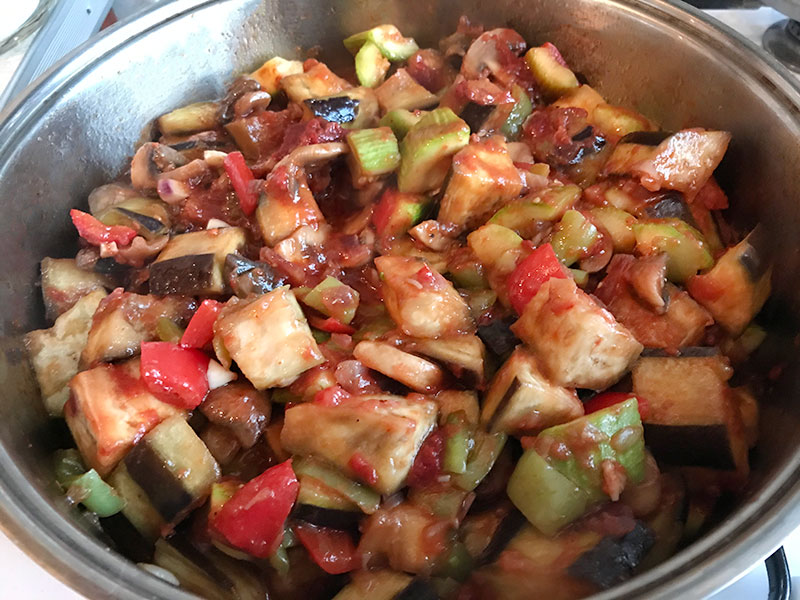 Bir tencerede 1 adet yemeklik doğranmış kuru soğanı, 2 adet yemeklik doğranmış kapya biberi ve 3 adet yemeklik doğranmış yeşil sivri biberi 1 çay bardağı sıvı yağ ile kavuruyoruz. Üzerine yarım kilo ince ince doğranmış kültür mantarlarını ilave ediyoruz ve biraz çeviriyoruz. 2 diş doğranmış sarımsak, 1 adet küp doğranmış kabak ve 2 adet küp doğranmış patlıcanı ekleyip biraz çeviriyoruz. Üzerine 3 adet rendelenmiş domates ilave edip 1 yemek kaşığı domates salçası koyuyoruz.