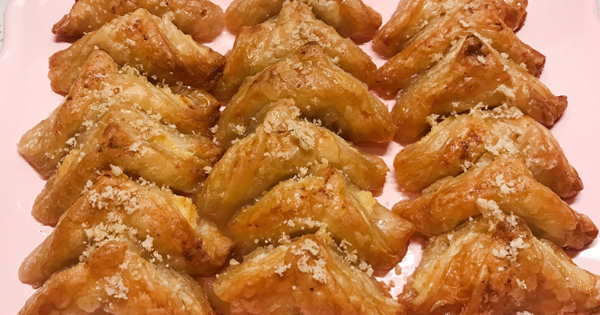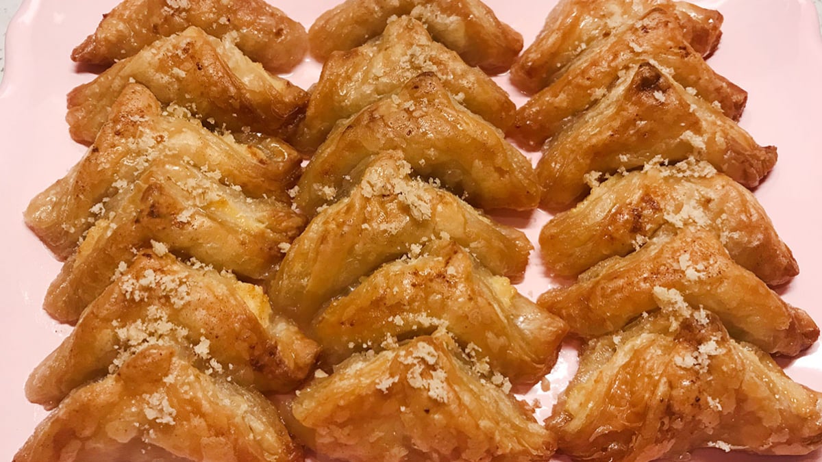 8 tane tekli milföyün her birini 4 eşit parçaya kesiyoruz. Kestiğimiz milföy parçalarına hazırladığımız irmikli iç harçtan birer çay kaşığı koyarak üçgen şekilde kapatıyoruz. Tüm milföyleri bu şekilde hazırlıyoruz ve cam fırın kabına diziyoruz.
