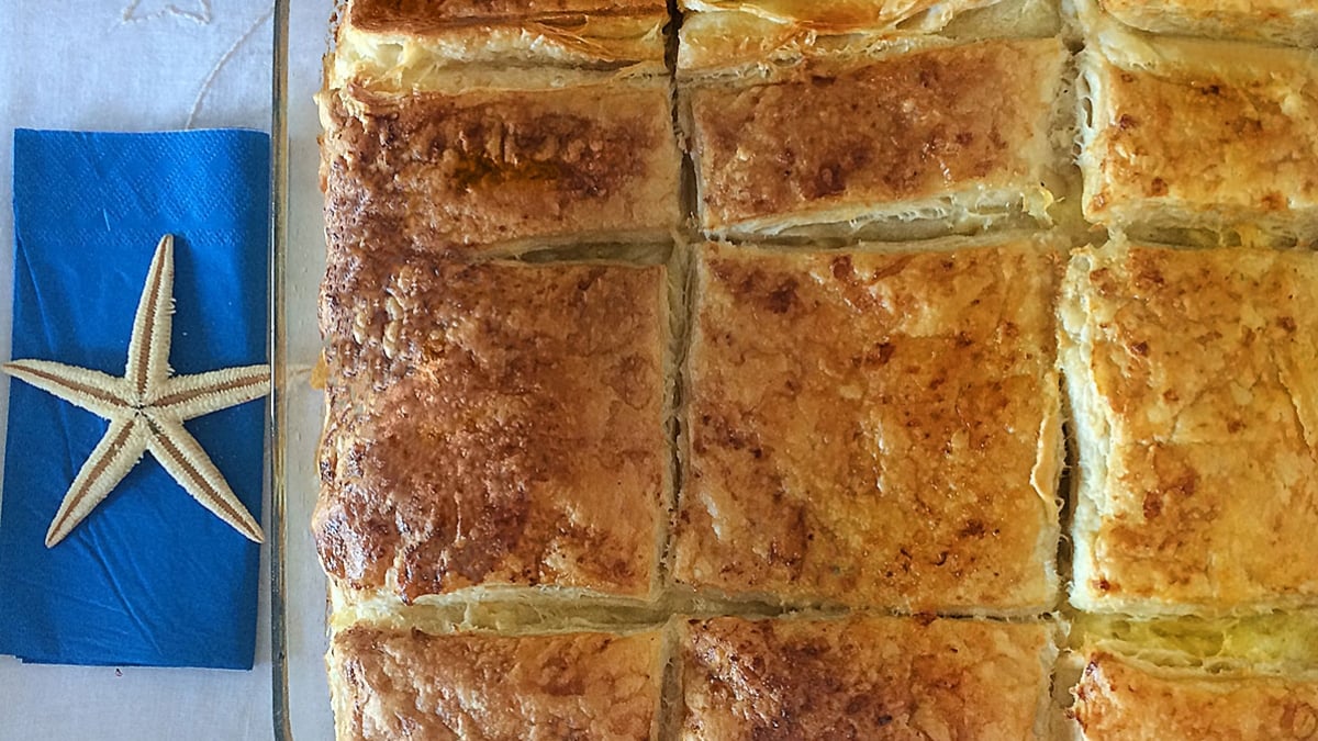 Kare bir cam kap ya da tepsinin altını sıvı yağ ile yağlıyoruz. Tabanını kaplayacak şekilde milföy hamuru ile en alt katını oluşturuyoruz. Üzerine 1 adet yufkayı parçalayarak koyuyoruz ve hazırladığımız peynirli harcı döküyoruz. Üzerine tekrar 1 adet yufka parçalıyoruz ve en üstü milföy hamuru ile kapatıp dilimlere kesiyoruz. En üste hazırladığımız sütlü sostan döküyoruz. 180 derecelik fırında kabarana kadar pişiriyoruz.
