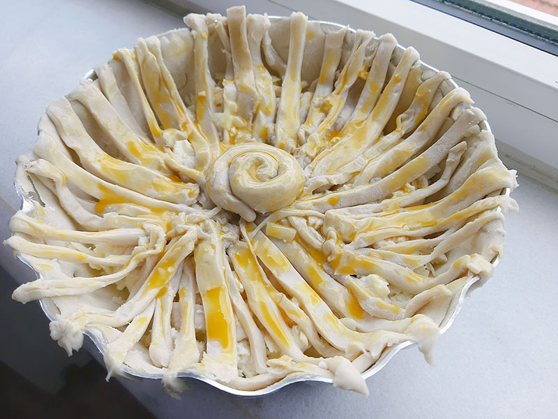 Hazırladığımız hamurun üzerine peynirli harcı döküyoruz. Üzerine tek dilim kare milföyü uzun şeritler halinde ince ince (olabildiğince) kesiyoruz. Ve kek kalıbının orta kısmından başlayarak etrafına diziyoruz. ( Tabi 1 dilim milföy yetmeyecektir kaplayana kadar kesiyoruz) Orta kısmına da kestiğimiz bir milföy şeridini yuvarlayarak gül haline getirip yerleştiriyoruz.