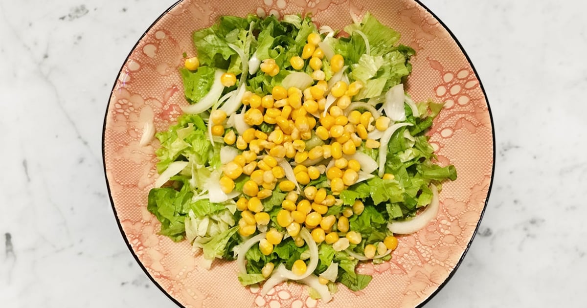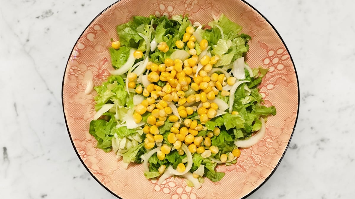 Bir salata kasesine 10 tane kıvırcık yaprağını doğruyoruz. Üzerine yarım jülyen doğranmış soğan ekliyoruz ve 1 çay bardağı haşlanmış mısır döküyoruz. (Eğer haşladığınız mısır fazla gelirse artanını soğuyunca didikleyerek buzdolabı poşeti yardımıyla buzluğunuzda saklayabilir ve gerektiğinde kullanabilirsiniz.) Zeytinyağı, tuz ve limon gezdirerek servis yapıyoruz. Afiyet olsun...