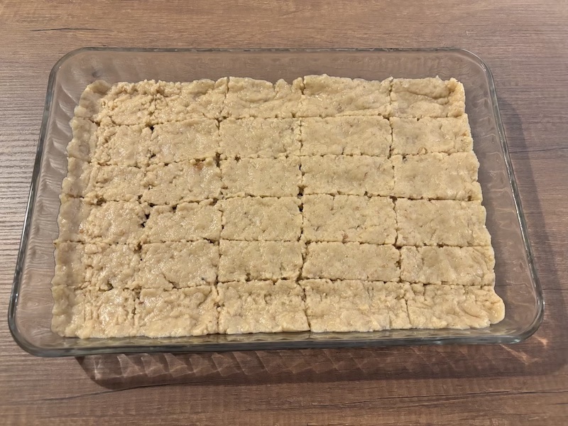 - Bir cam fırın kabına hazırladığımız hamuru eşit şekilde yayıyoruz. Üzerine çatal yardımıyla şekil veriyoruz. Küçük dilimler halinde bıçak yardımıyla tatlımızı kesiyoruz.