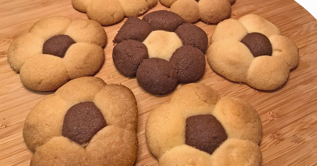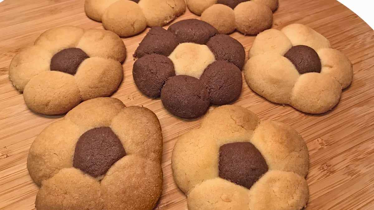 Hazırladığımız iki ayrı kurabiye hamurundan fındıktan biraz büyük parçalar alıyoruz ve avucumuzda yuvarlıyoruz. Daha sonra yuvarladığımız hamurları yağlı kağıt serili fırın tepsisi içine papatya şeklinde birleştiriyoruz ve önceden ısıtılmış 190 derecelik fırında 20 dakika kadar pişiriyoruz.