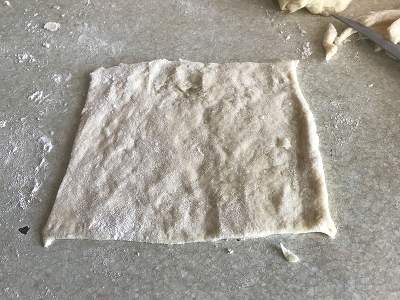 Bir yoğurma kabına 1 adet yumurta kırıp çatal yardımıyla çırpıyoruz. Üzerine 2.5 su bardağı un, yarım su bardağı su ve 1 tatlı kaşığı tuz koyarak hepsini güzelce yoğuruyoruz. Yoğurduktan sonra hamuru mandalina büyüklüğünde bezelere ayırıyoruz. Ayırdığımız bezelere biraz un serperek oklava yardımıyla kare şeklinde açıyoruz.