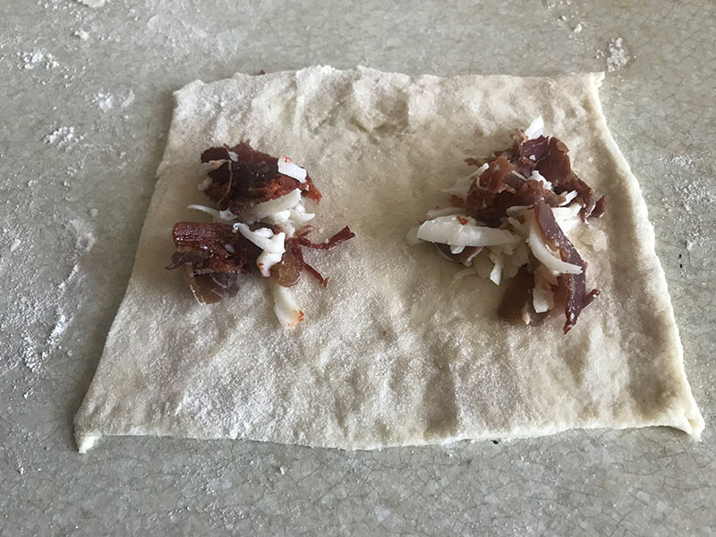 Hamurun üzerine sağ ve sol tarafına birer yemek kaşığı hazırladığımız pastırmalı kaşarlı harçtan koyuyoruz.