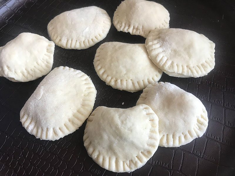 İki parça elde ediyoruz ve kenar kısımları çatal yardımıyla bastırarak kapatıyoruz. Tüm hamuru bu şekilde hazırlıyoruz.