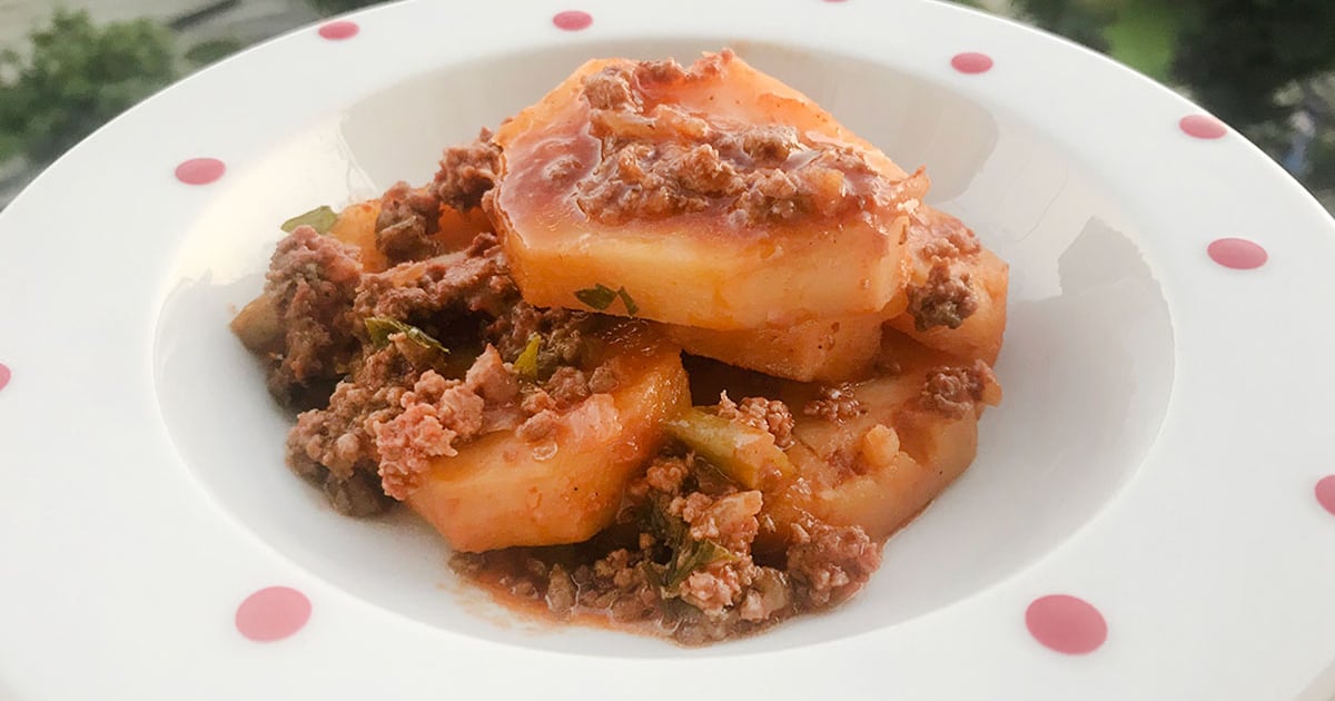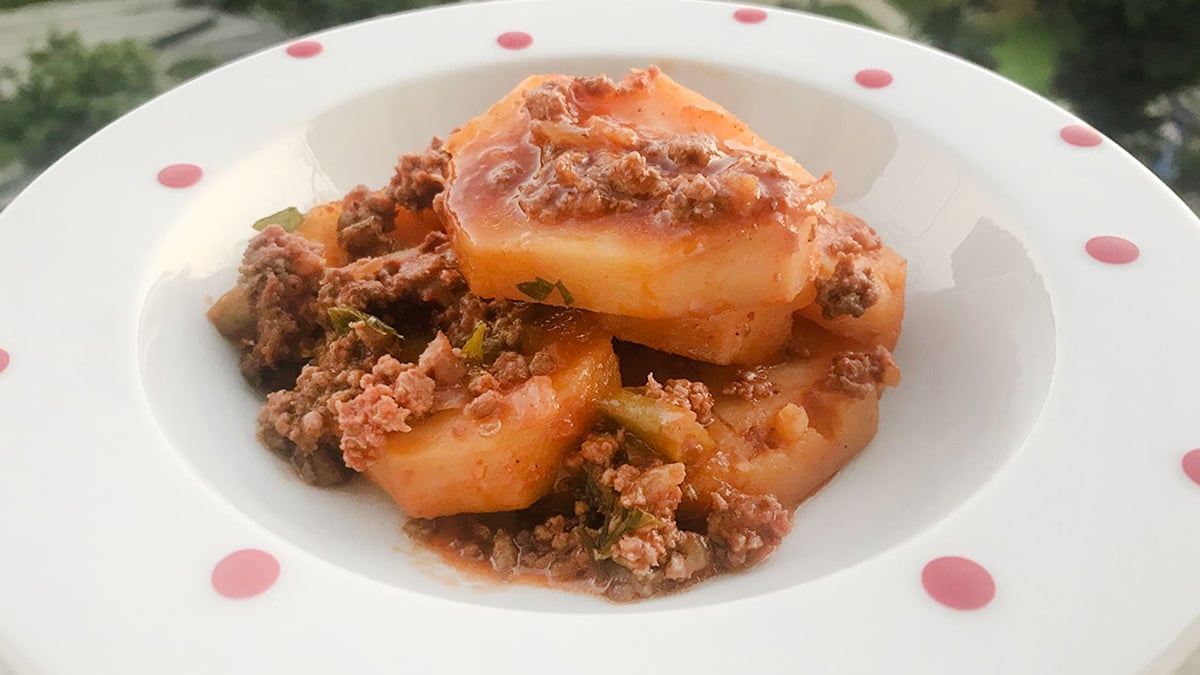 Bir pilav tenceresinin alt kısmına kızarttığımız patatesleri diziyoruz. Üzerlerine biraz tuz serpiyoruz. Üzerine hazırladığımız kıymalı harcı döküyoruz. Tencereye patateslerin üzerine çıkmayacak kadar su ilave ediyoruz ve ocağa alıyoruz. Kaynayınca kısık ateşe alıp pişmeye bırakıyoruz. Afiyet olsun…