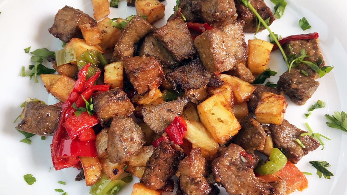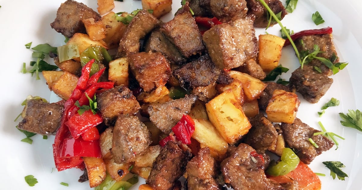 Ciğer kavurma ile kapya biberin yakıştığını kapya biberli ciğer kavurma tarifimizde söylemiştik. Şimdi içerisine kızarmış patates de ekledik ve lezzetine doyamadık!