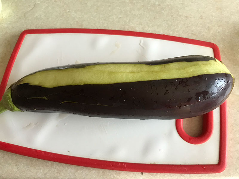1 adet patlıcanın baş kısmını kesmeden alacalı şekilde soyuyoruz ve bir kaba alıp üzerine çıkana kadar su koyuyoruz. Suyuna yarım tatlı kaşığı tuz atıyoruz ve bu şekilde 10 dakika bekletiyoruz.