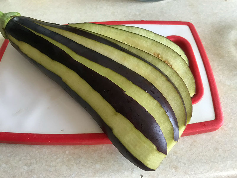 Beklettiğimiz patlıcanı sudan alıp hafifçe elimizle sıkıyoruz. Patlıcanı 6 adet yaprak oluşacak şekilde kesiyoruz ama baş kısmını kesmiyoruz ki yapraklar birbirine bağlı kalsınlar.