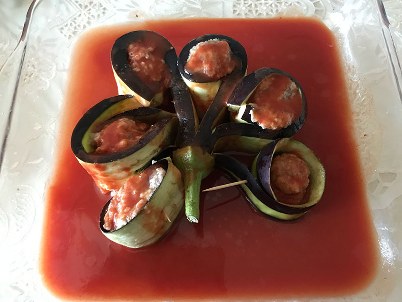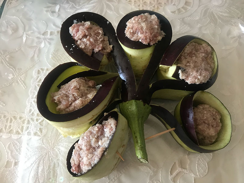 Yaprakların her birinin uç kısmına hazırladığımız top köftelerden koyuyoruz ve çevirerek sarıyoruz. Patlıcanın sapının olduğu kısımları kürdan ile sabitliyoruz ki açılmasın. Hazırladığımız patlıcanı bu şekilde bir cam fırın kabına alıyoruz.