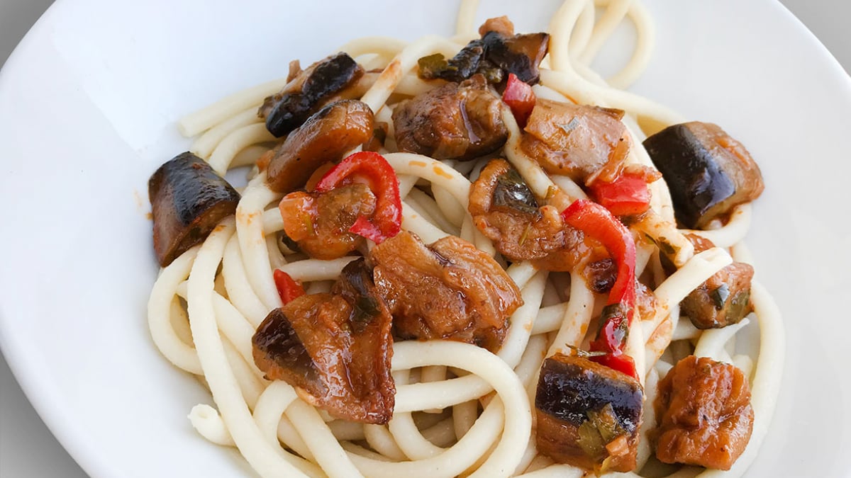 Bir tavada yarım çay bardağı sıvı yağ, 1 tane yemeklik doğranmış kuru soğan, 1 tane yemeklik doğranmış kırmızı kapya biber ve 1 tane yemeklik doğranmış sivri biberi ekleyip birlikte kavuruyoruz. Üzerine 2 tane zebra şeklinde soyarak tuzlu suda 10 dakika bekletip sıktığımız ve parmak şeklinde doğradığımız patlıcanları da içerisine atıyoruz ve hepsini birlikte kavuruyoruz. Üzerine yarım yemek kaşığı domates salçası ilave edip biraz çevirdikten sonra üzerine çıkmayacak şekilde biraz su ilave ediyoruz. (Makarna üzerine koyacağımız için biraz suyunu çekmiş olması gerekiyor) Yarım çay kaşığı karabiber, 1 çay kaşığı pul biber ve yarım tatlı kaşığı tuz atıp kaynayınca kısık ateşte pişmeye bırakıyoruz.