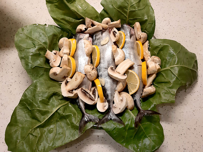 Ortasına da 1 yaprak koyuyoruz. Pazıların üzerine ayıklanmış ve yıkanmış 3 adet küçük palamutu tuzladıktan sonra koyuyoruz.