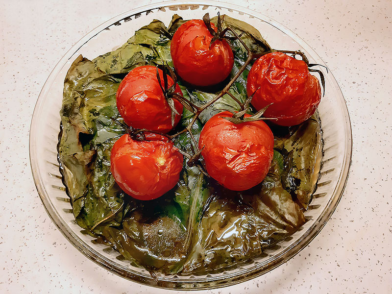 Kenarlarındaki yaprakları üzerine kapatıyoruz. Ortasına salkım domates yerleştiriyoruz. Domateslerin üzerine 1 yemek kaşığı sıvı yağ gezdiriyoruz. 200 derecelik fırında 35 dakika pişiriyoruz. Sıcak servis yapıyoruz. Afiyet olsun...
