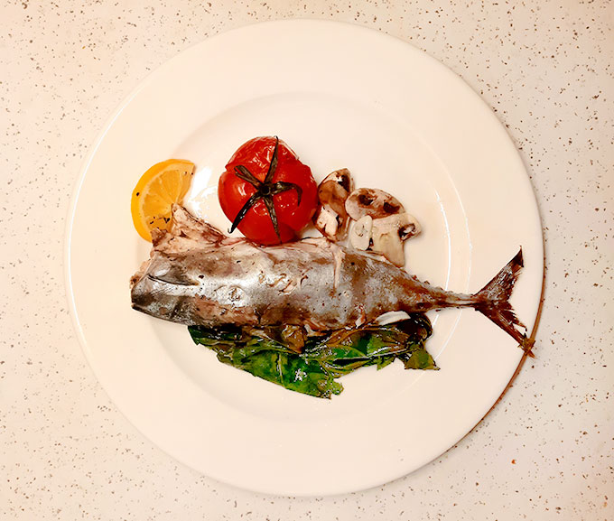 Palamutların aralarına limon dilimleri yerleştiriyoruz. 10 adet ikiye bölünmüş kültür mantarlarını da üzerine yerleştiriyoruz. Üzerlerine 2 yemek kaşığı sıvı yağ gezdiriyoruz. Yarım çay kaşığı karabiber serpiyoruz.