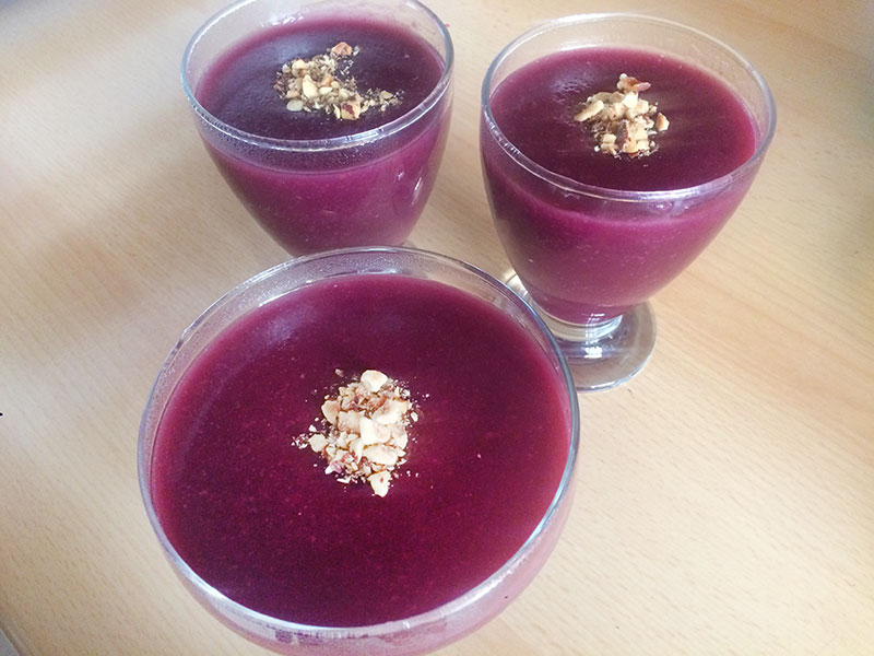 2 kilo kokulu siyah üzümü saplarından ayıklıyoruz ve yıkıyoruz. Temizlediğimiz üzümleri bir tencereye alıyoruz. Ellerimizle üzümleri sıkarak sularını çıkartıyoruz. Ezdiğimiz üzümlerin üzerine 2 su bardağı su ilave ediyoruz ve ocağa alarak kaynamaya bırakıyoruz. Yarım saat bu şekilde pişiriyoruz. Pişirdikten sonra üzümleri süzgeçten geçirip posalarını ayırıyoruz ve atıyoruz. Kalan üzüm suyunu tekrar tencereye alarak üzerine 1 su bardağı mısır unu ve 1 su bardağı toz şeker ilave edip çırpıcı yardımıyla karıştırarak muhallebi kıvamına gelene kadar 20 dakika boyunca pişiriyoruz.