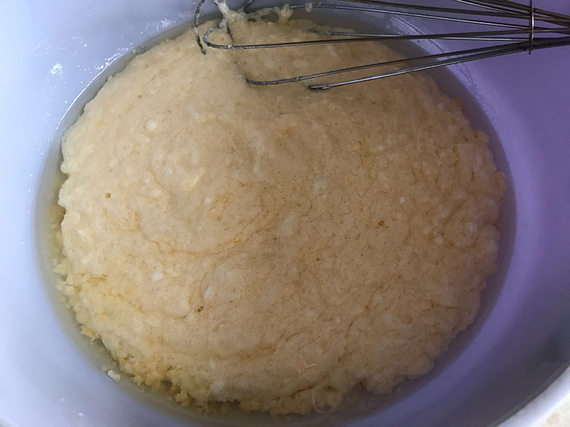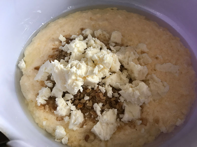 Üzerine 50 gram ufalanmış beyaz peynir ve yarım su bardağı dövülmüş ceviz ilave ediyoruz. Tüm malzemeyi iyice yoğuruyoruz.