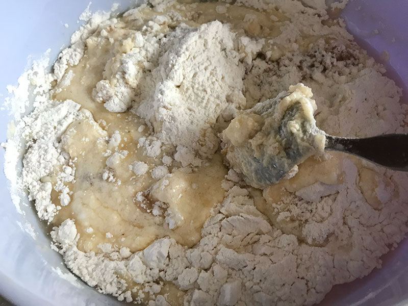 Üzerine aldığı kadar un ekliyoruz. 1 paket kabartma tozu döküyoruz. Biraz daha karıştırıyoruz.