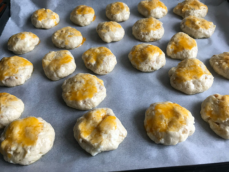 Elimize yapışmayacak şekilde bir hamur elde ediyoruz. Bu hamurdan elimize ceviz büyüklüğünde parçalar alarak yuvarlıyoruz ve yağlı kağıt serdiğimiz fırın tepsisine diziyoruz. Tüm hamuru bu şekilde hazırlıyoruz.