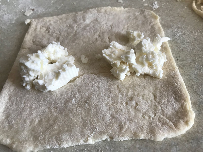 Hamurun üzerine sağ ve sol tarafına birer yemek kaşığı peynir koyuyoruz.