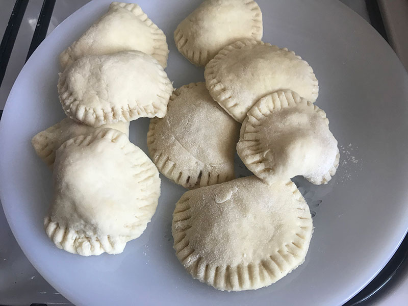 İki parça elde ediyoruz ve kenar kısımları çatal yardımıyla bastırarak kapatıyoruz. Tüm hamuru bu şekilde hazırlıyoruz.