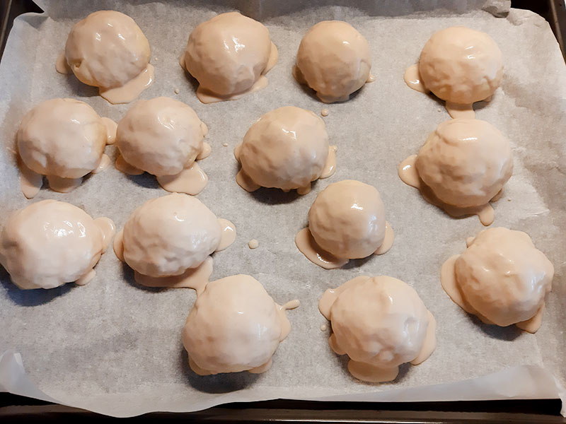 Bir kaseye yarım su bardağı su, yarım su bardağı pirinç unu, 2 yemek kaşığı sıvı yağ, 1 tatlı kaşığı toz şeker, 1 çay kaşığı tuz ve 1 paket kuru maya koyarak çırpıcı yardımıyla iyice karıştırıyoruz. Tepsiye dizdiğimiz poğaçaların üzerine biraz bastırdıktan sonra hazırladığımız bu sostan üzerlerine birer tatlı kaşığı döküyoruz ve her yerine yayıyoruz. Kalan sosu da hepsine eşit şekilde döküyoruz. Önceden ısıtılmış 220 derecelik fırında 15 dakika pişirdikten sonra fırının derecesini 200 dereceye düşürerek 10 dakika daha nar gibi kızarana kadar pişiriyoruz. Pişen poğaçaları fırından çıkardıktan sonra biraz dinlendirdikten sonra servis yapıyoruz. Afiyet olsun…