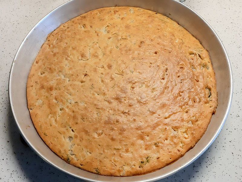 Yuvarlak ve orta boy bir fırın tepsisine hazırladığımız harcı döküyoruz ve 190 derecelik fırında 25-30 dakika pişiriyoruz. Servis tabağına alarak dilimleyerek servis yapıyoruz. Afiyet olsun...
