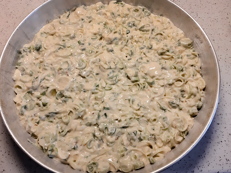 Bir kapta 2 tane yumurta ve 1 su bardağı yoğurdu çırpıyoruz. Üzerine 1 su bardağı sıvı yağ, aldığı kadar bardağı un (kek kıvamında olacak şekilde), 1 tane kabartma tozu, 1 tatlı kaşığı tuz ve 6 tane ince doğranmış pırasa ilave edip kaşık yardımıyla karıştırıyoruz.