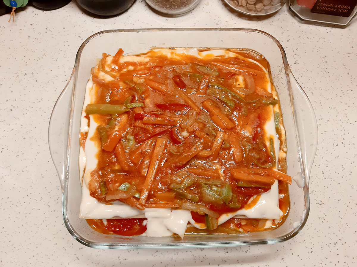 Bir cam fırın kabını sıvı yağ ile yağlıyoruz. Alt kısıma biraz beşamel sostan sürüyoruz. Lazanyaları üzerine diziyoruz. Lazanyaların üzerine sebzeli harçtan biraz döküyoruz. 1 avuç kaşar rendesi serpiyoruz. Tekrar beşamel sostan döküp tekrar lazanya diziyoruz. Bunu 4 kat için yapıyoruz. (Dilediğiniz sadece bir kata kaşar rendesi koyuyoruz.) En üst kısma yine sostan sürdükten sonra her yerini kaşar rendesi ile kaplıyoruz. 180 derecede üzeri kızarana kadar pişiriyoruz. Afiyet olsun…