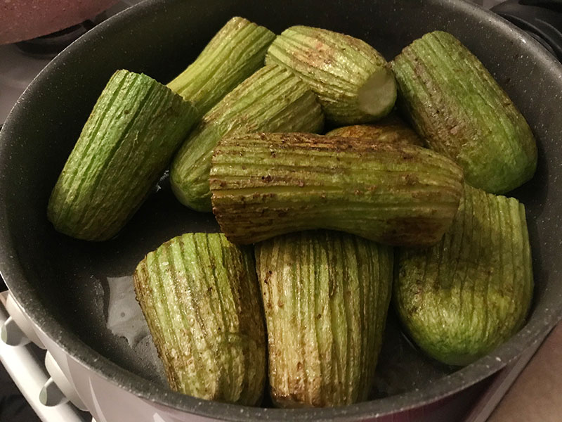 5 adet kabağın baş kısımlarını kesiyoruz. Çatal yardımıyla üzerlerine uzun çizikler atıyoruz. Ortadan ikiye bölüyoruz. Kabak oyacağı ile içlerini oyuyoruz. Tavada kızgın yağda maşa yardımıyla çevirerek kızartıyoruz ve bir kenara alıyoruz.