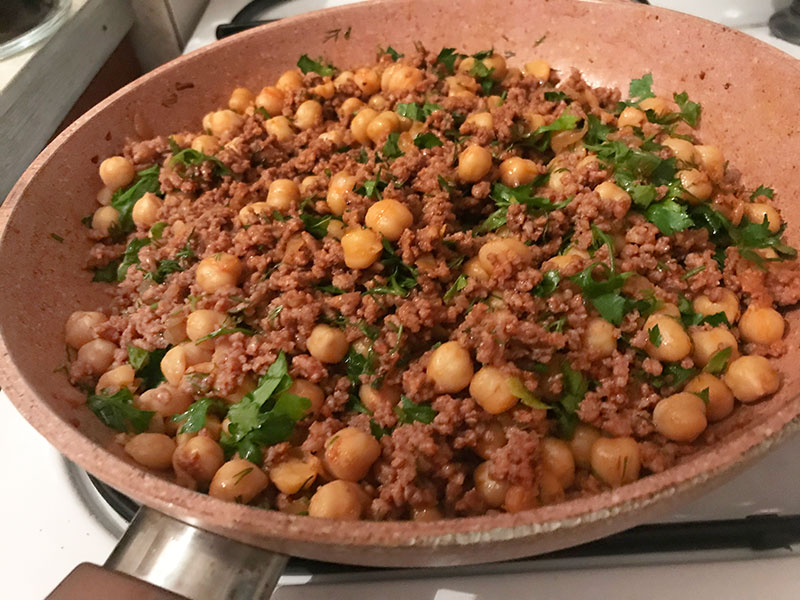 Bir tavaya 1 adet kuru soğanı yemeklik doğruyoruz. 1 yemek kaşığı dolmalık fıstık ilave ediyoruz ve yarım çay bardağı sıvı ile kavuruyoruz. 1 diş rendelenmiş sarımsak ekliyoruz. Üzerine 250 gram kıyma koyup ve onu da kavuruyoruz. 1 yemek kaşığı domates salçası ilave ediyoruz ve biraz çeviriyoruz. 1 su bardağı haşlanmış nohut döküyoruz. 1 avuç doğranmış maydanoz ekliyoruz. 1 tatlı kaşığı tuz, 1 tatlı kaşığı kuru nane, yarım çay kaşığı pul biber ve yarım çay kaşığı karabiber serpiyoruz. Tüm malzemeyi harmanlıyoruz ve ocaktan alıyoruz.