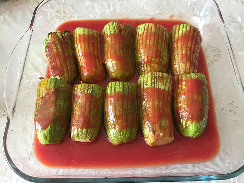 Sosu için bir kapta 1 yemek kaşığı domates salçası ile 1.5 su bardağı suyu karıştırıyoruz. Hazırladığımız bu sosu kabakların üzerine gezdirerek döküyoruz.