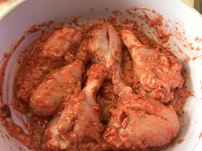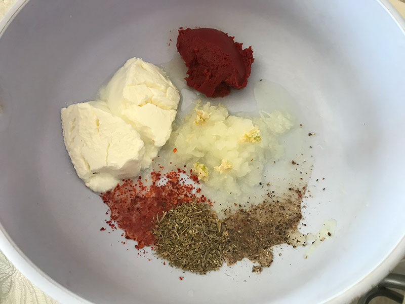 Bir kaba 1 adet kuru soğan ve 2 diş sarımsak rendeliyoruz. 1 yemek kaşığı domates salçası, 2 yemek kaşığı yoğurt ve yarım çay bardağından bir parmak fazla sıvı yağ koyuyoruz. 1.5 tatlı kaşığı kekik, 1 çay kaşığı karabiber, 1 çay kaşığı pul biber ve yarım tatlı kaşığı tuz serpiyoruz.