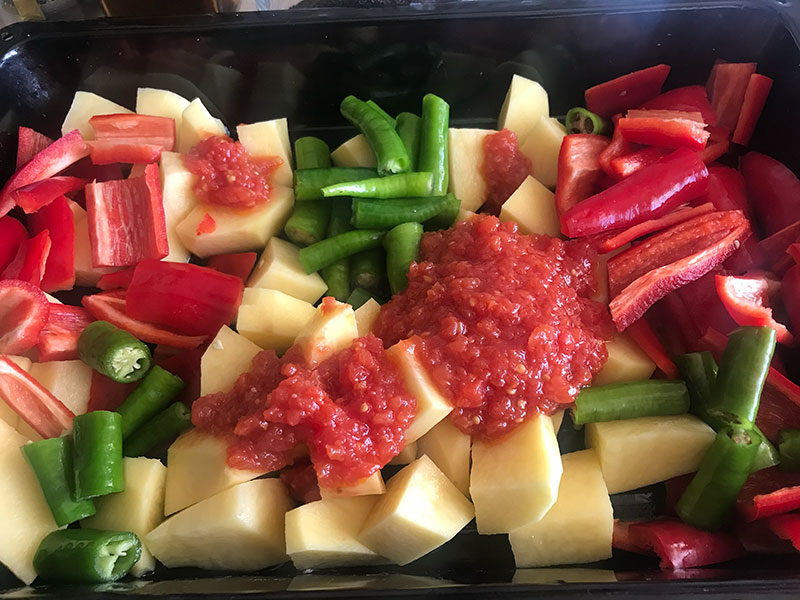 Bir fırın tepsisine 3 adet patatesi iri iri doğruyoruz. 6 adet yeşil sivri biber ve 3 adet çekirdekleri çıkarılmış kırmızı kapya biberi de iri iri doğruyoruz. 1 adet domates rendeliyoruz. 2 yemek kaşığı sıvı yağ gezdiriyoruz. 1 tatlı kaşığı tuz serpiyoruz ve tüm malzemeyi güzelce harmanlıyoruz.