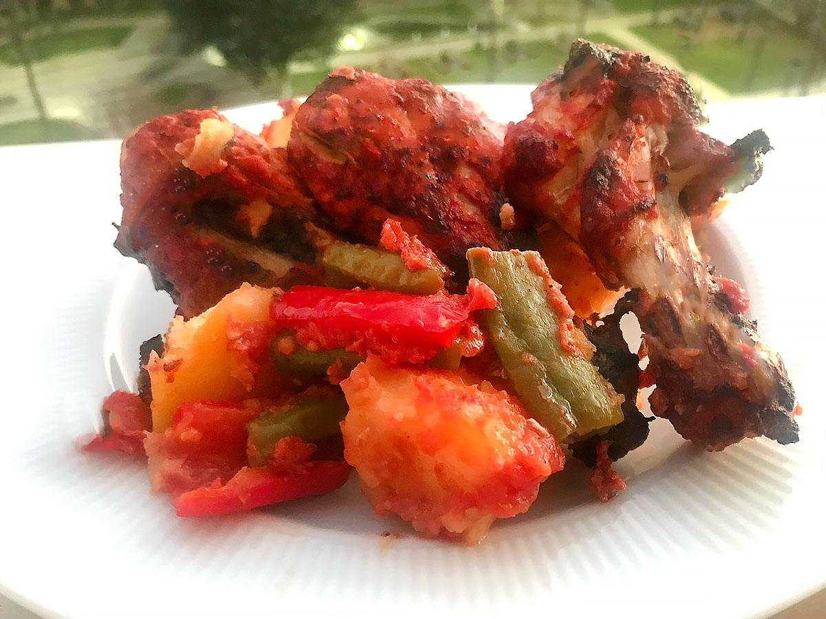 Hazırladığımız bu malzemelerin üzerine sosladığımız tavuk butlarını yerleştiriyoruz. (Kapta kalan sostan tavukların ve sebzelerin üzerine fırça yardımıyla sürebilirsiniz. )
