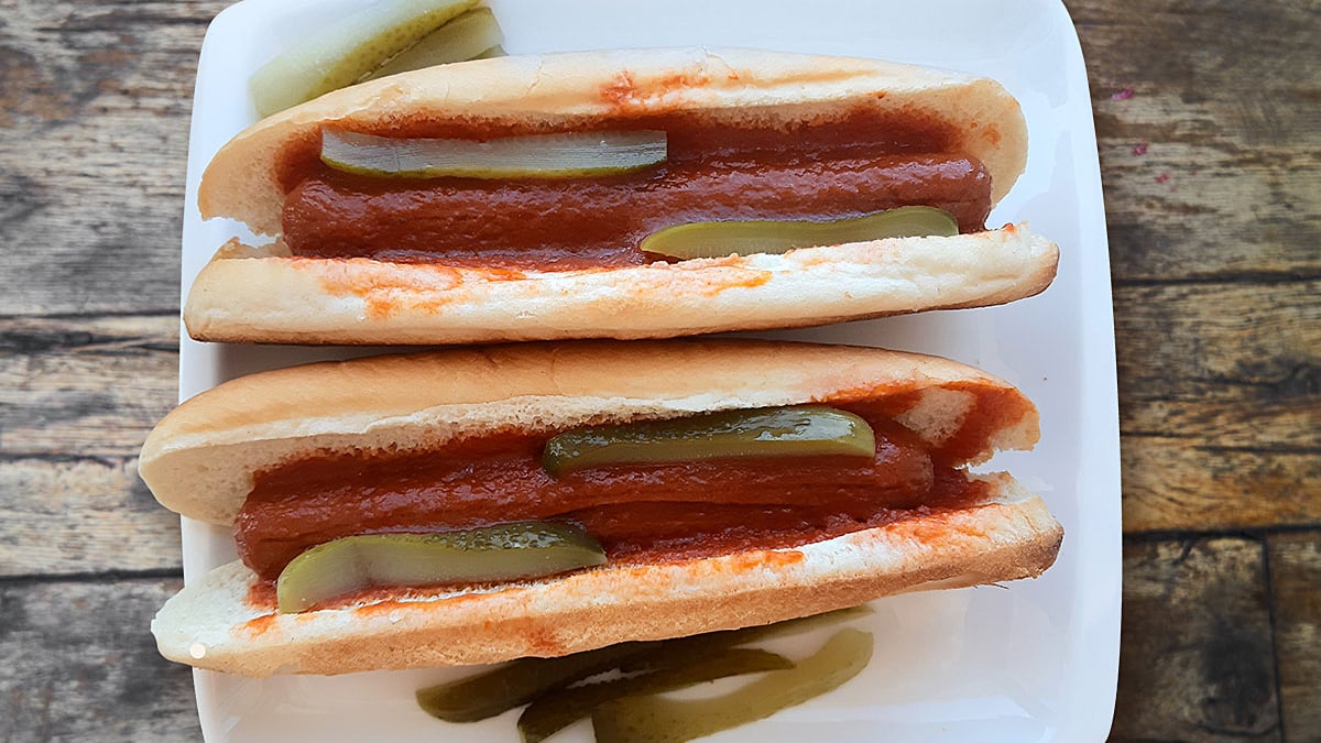 4 adet uzun sosisi yıkıyoruz ve kuruluyoruz. Üzerlerine bıçak yardımıyla uzunlamasına kesikler atıyoruz. (Yarmıyoruz) Hazırladığımız sosisleri bir tavaya alıyoruz ve üzerine yarım çay bardağı sıvı yağ dökerek biraz sosisleri kızartıyoruz. (Çok az) Üzerine 1 yemek kaşığı domates salçası ilave ediyoruz. Salçayı ezerek açıyoruz ve 2 yemek kaşığı ketçap ekliyoruz. 1 su bardağı su ilave ediyoruz. 1 çay kaşığı tuz serpiyoruz. Bir taşım kaynatıyoruz ve altını kısıyoruz, sosisler pişince ocaktan alıyoruz. Sandviç ekmeklerinin arasına önce sostan döküyoruz. Sonra sosisleri koyup üzerine tekrar sos gezdiriyoruz. Aralarına salatalık turşusu koyarak servis yapıyoruz. Afiyet olsun…