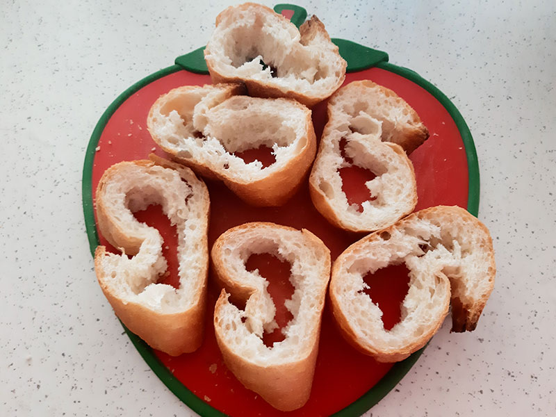 6 dilim ekmeğin iç kısımlarını çıkarıyoruz ve bir kaba ufalıyoruz.