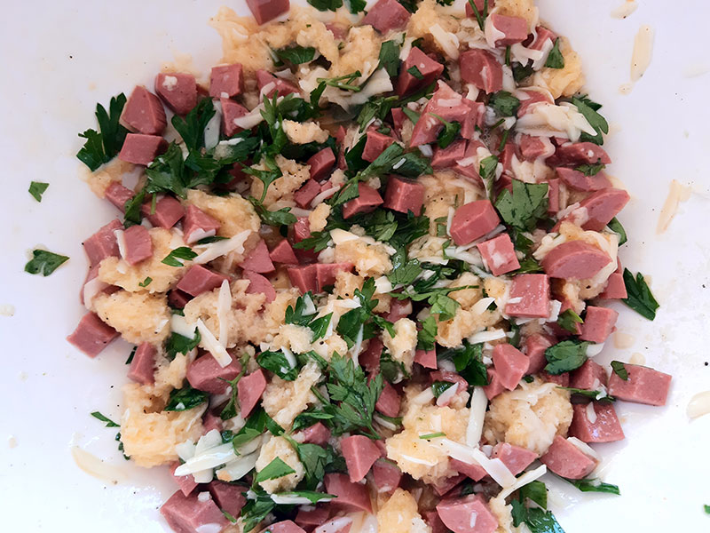 Kabın içerisine 3 adet uzun sosisi küp küp doğruyoruz. 1 adet yumurta kırıyoruz. 50 gram kaşar peyniri rendeliyoruz. 1 avuç maydanozu ince ince doğruyoruz. Biraz karabiber ve tuz serpiyoruz. Tüm malzemeyi harmanlıyoruz.