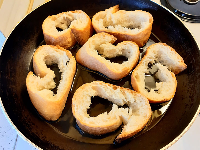 Bir tavaya sıvı yağ döküyoruz ocağın altını kısıyoruz ve içlerini çıkardığımız ekmekleri tavaya alıyoruz.
