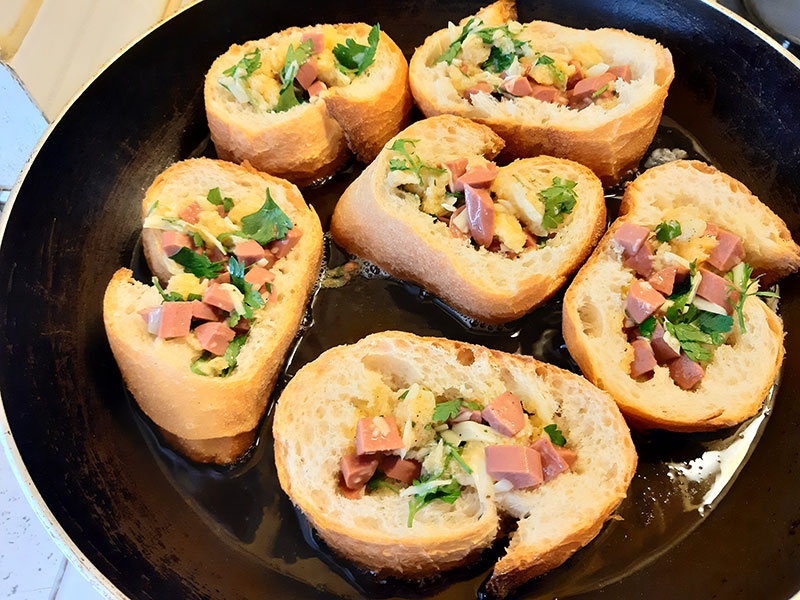 Ekmeklerin içlerine hazırladığımız iç harcı dolduruyoruz. Ekmekleri doldurduktan sonra ocağın altını açıyoruz ve alt kısımları kızarınca alt üst ederek güzelce kızartıyoruz.