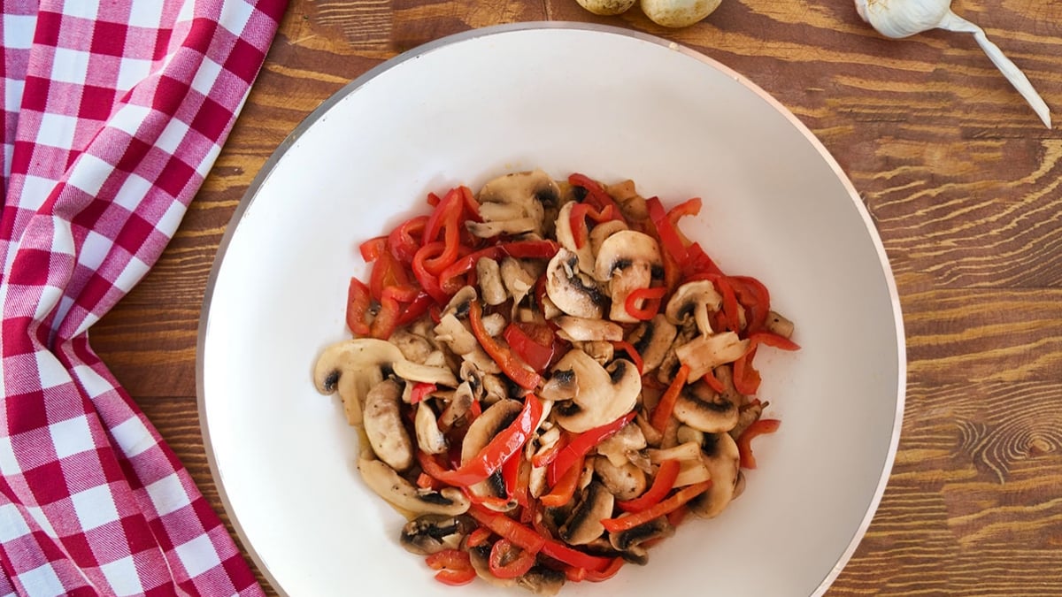 Bir tavada 1 tane yemeklik doğranmış soğan, 1 diş doğranmış sarımsak, 1 tane jülyen doğranmış kırmızı biberi yarımdan biraz fazla çay bardağı sıvı yağ ile kavuruyoruz. Üzerine kabuklarını temizlenmiş ve yıkanmış 10 tane kültür mantarını doğruyoruz. 1 çay kaşığı tuz, yarım çay kaşığı karabiber, yarım çay kaşığı pul biber atıp biraz çeviriyoruz ve üzerine 1 yemek kaşığı soya sosu ekleyip iyice kavuruyoruz. 1 çay bardağı su ilave edip kısık ateşte pişiriyoruz. Afiyet olsun...