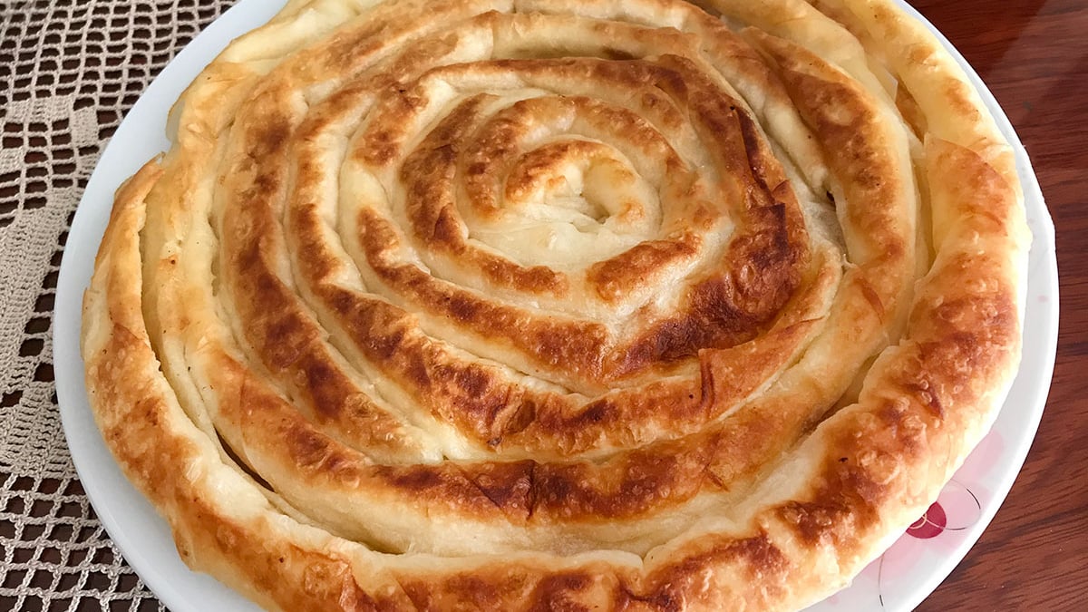 1 adet yufkayı tezgaha bütün halde açıyoruz. Hazırladığımız yağlı sosu üzerine gezdiriyoruz. Bir kenarına 150 gram beyaz peynirden biraz koyuyoruz ve bütün yufkayı sıkı şekilde rulo halinde sarıp yağladığımız tavaya alıyoruz. Ortadan başlayarak etrafında döndürerek sarıyoruz. (Fotoğraftaki gibi gül şeklini veriyoruz) Diğer kalan 3 yufkayı da aynı şekilde hazırlayıp ortaya yaptığımız gül şeklinin etrafına sararak devam ediyoruz. Ocağın altını yakıyoruz. Kısık ateşte alt üst ederek kızarana kadar pişiriyoruz. Afiyet olsun…