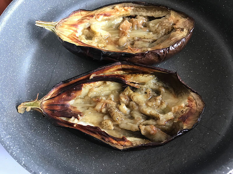 Bu şekilde kızgın yağda alt üst ederek kızartıyoruz. Kızarttığımız patlıcanları bir cam fırın kabına alıyoruz. Soğuduktan sonra iç kısımlarını biraz oyuyoruz ve oyduğumuz patlıcan içlerini atmıyoruz bir kenara alıyoruz.(kullanacağız)
